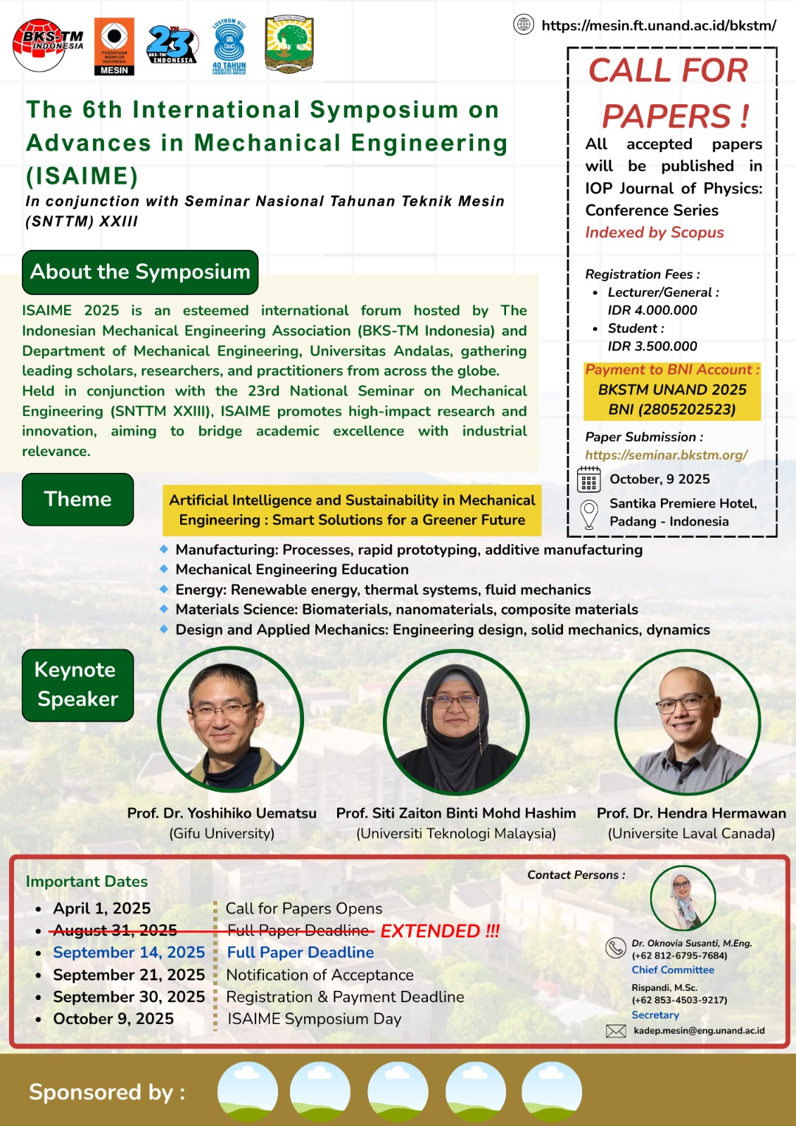 International Symposium on Advances and Innovation in Mechanical Engineering (ISAIME) is international conference initiated by Badan Kerja Sama Teknik Mesin (BKSTM), Indonesian national organization on Mechanical engineering. It will be hosted by Departement of Mechanical Engineering, Universitas Andalas, Padang, Indonesia on 09 October 2025 (online and offline) The event is bringing together researchers, scientists, and engineers from academia and industry to present and exchange ideas with a focus on the advancement of mechanical engineering and technologies. All accepted papers will be included in ISAIME 2025 conference proceeding and All papers (subject to the final acceptance by the AIP editor) will be published in the AIP Conference Proceeding (Scopus-Indexed)